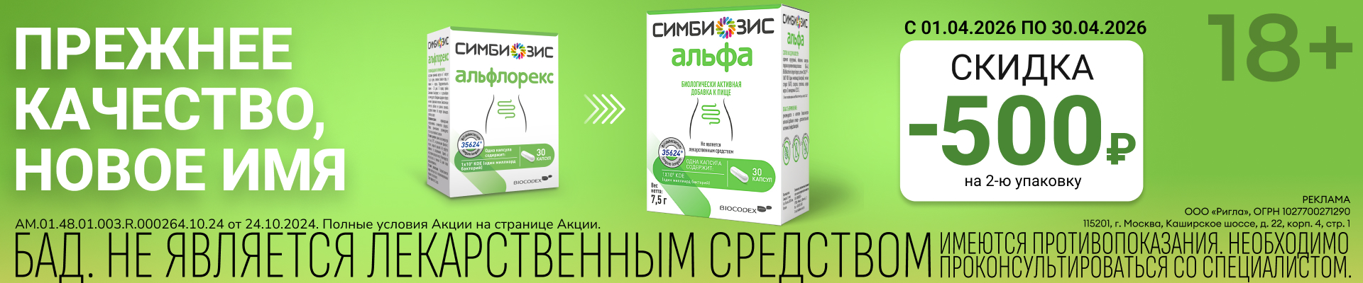 Скидка 500 рублей на 2-ю упаковку Симбиозис Альфлорекс и Альфа.